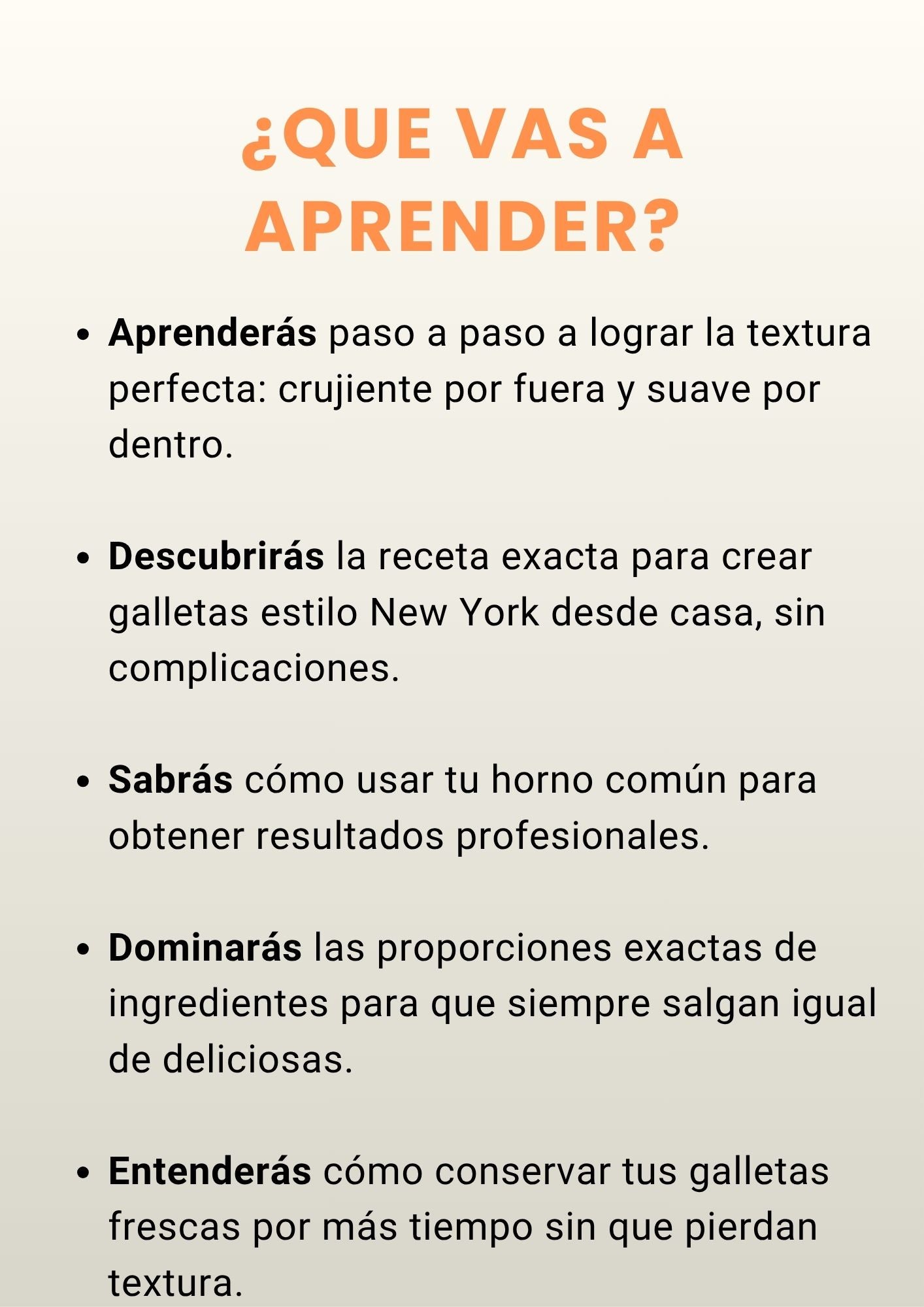 Recibirás un libro digital (PDF descargable) con las recetas, medidas exactas, tips y secretos para lograr las auténticas galletas estilo New York.